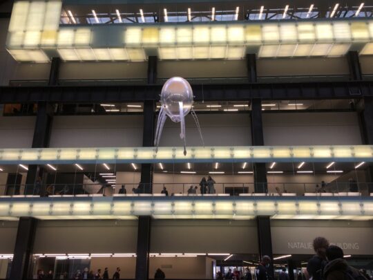 In Love with the World, Anicka Yi’s aerobes installation gracing the Turbine Hall at Tate Modern includes xenojellis and planulae, aquatic and terrestrial. These floating hybrid eco-tech machine species (mobile thanks to UAVs) develop individual and group behaviours over time, influenced by elements in the ecosystem. What if AI could learn through the senses rather than the brain? Could machines develop their own experiences of the world and exchange intelligence with plants, animals and micro-organisms?!